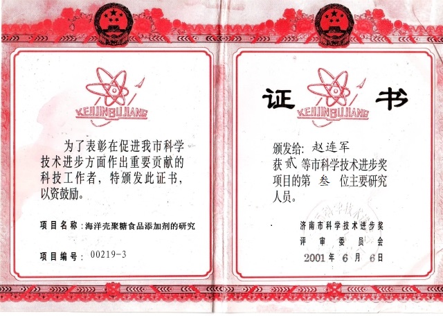 赵连军,山东奥康生物科技公司总经理、硕士研究生、高级工程师、长期致力于甲壳素、壳聚糖、壳寡糖及其它生物技术产品和天然产物的研究开发。